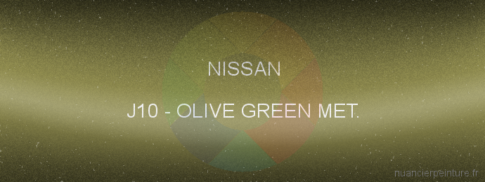 Retrouvez toutes les informations sur la couleur J10 Olive Green Met. pour voiture Nissan. Cette teinte, sortie sur les voitures Nissan dans les années 2002 - 2005, nécessite une sous-couche gris moyen et est utilisée sur les carrosserie. Sa couleur dominante est le vert.